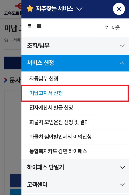 1. "고속도로 통행료 홈페이지" 접속하신 후 자주 찾는 서비스 - "미납고지서 신청"을 클릭해 주세요.