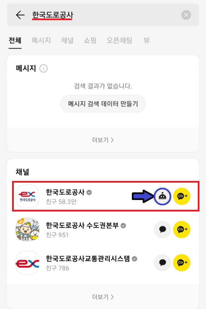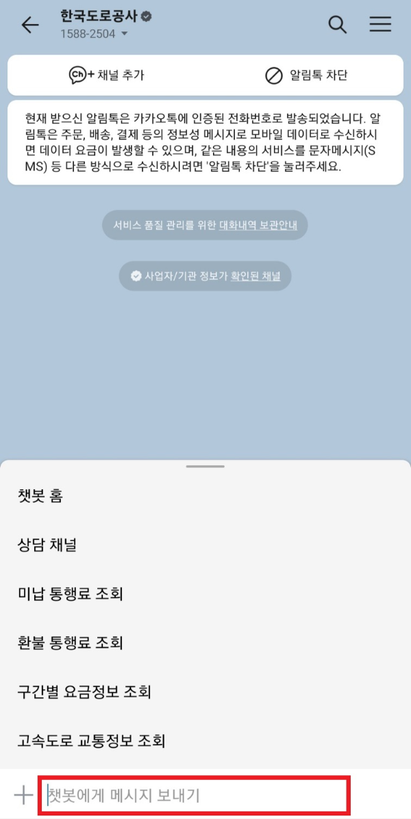 "카카오톡" 메인 화면에서 검색(돋보기) 눌러 "한국도로공사"를 입력하시면 한국도로공사 채널에 챗봇상담을 클릭해주세요.