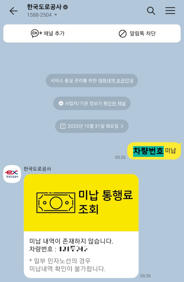 챗봇상담 아이콘을 누르시면 카카오톡 대화창이 개설됩니다. 챗봇상담은 자주 문의하는 질문들 미납 통행료 조회, 환불 통행료 조회, 구간별 요금정보 조회, 고속도로 교통정보 조회 등 다양한 정보를 확인할 수 있습니다. 챗봇에게 메시지 보내기를 눌러 "본인의 차량번호 + 미납"을 입력해 주세요.(000루 0000 미납)
