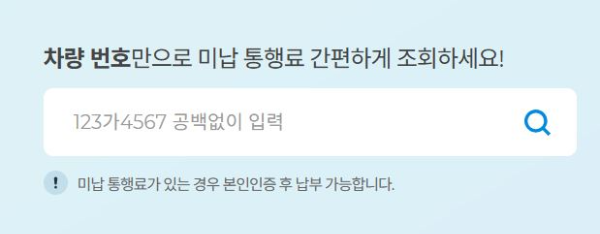 통행료 미납 요금 조회는 고속도로 통행료 홈페이지에서 비회원으로 간편하게 조회가능합니다. 홈페이지로 이동하시면 메인환면에 "차량번호"만으로 간편하게 통행료를 조회할 수 있도록 베너가 설치되어 있습니다.