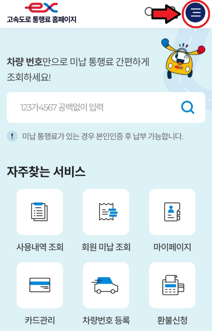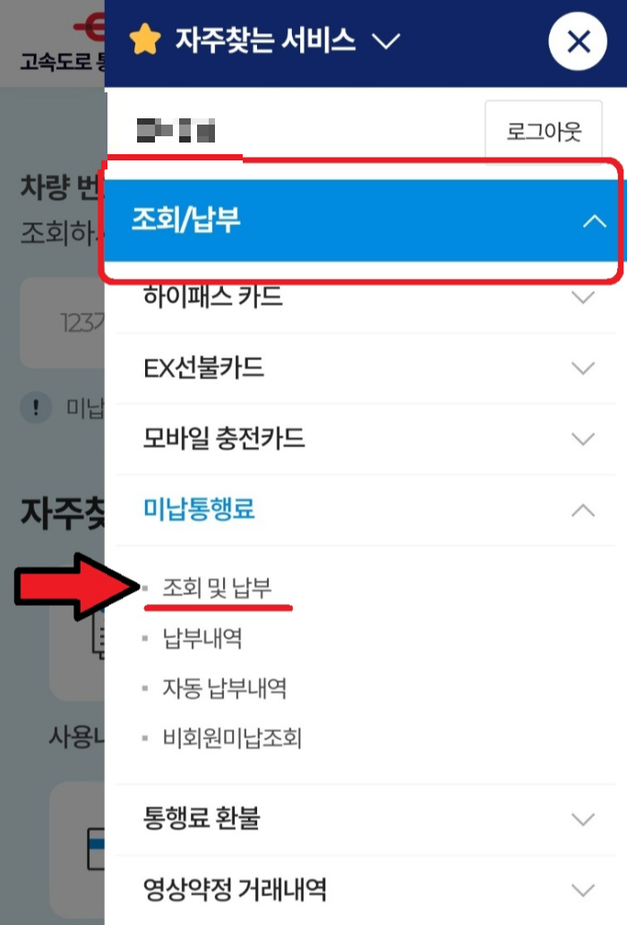 "고속도로 통행료 홈페이지( PC버전 또는 모바일)"로 가셔서 「메뉴 → 자주 찾는 서비스 → 조회/납부 → 미납통행료(조회 및 납부)"를 통해 납부가능합니다. 미납요금 조회는 비회원으로 가능하지만 납부하기 위해서는 회원가입 후 로그인해 주세요.