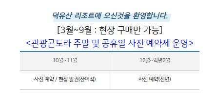 관광곤도라 3월 ~ 9월은 현장발권으로 이용가능하며, 10월 ~ 2월은 주말(공휴일 포함) 사전예약제로 운영합니다.