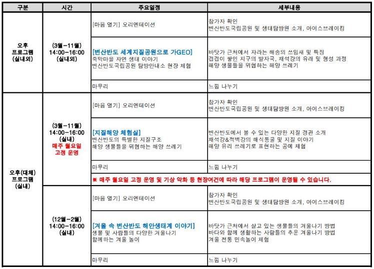 오리엔테이션 → 죽막마을 자연 생태 이야기 → 변산반도 국립공원 탐방안내소 현장체험