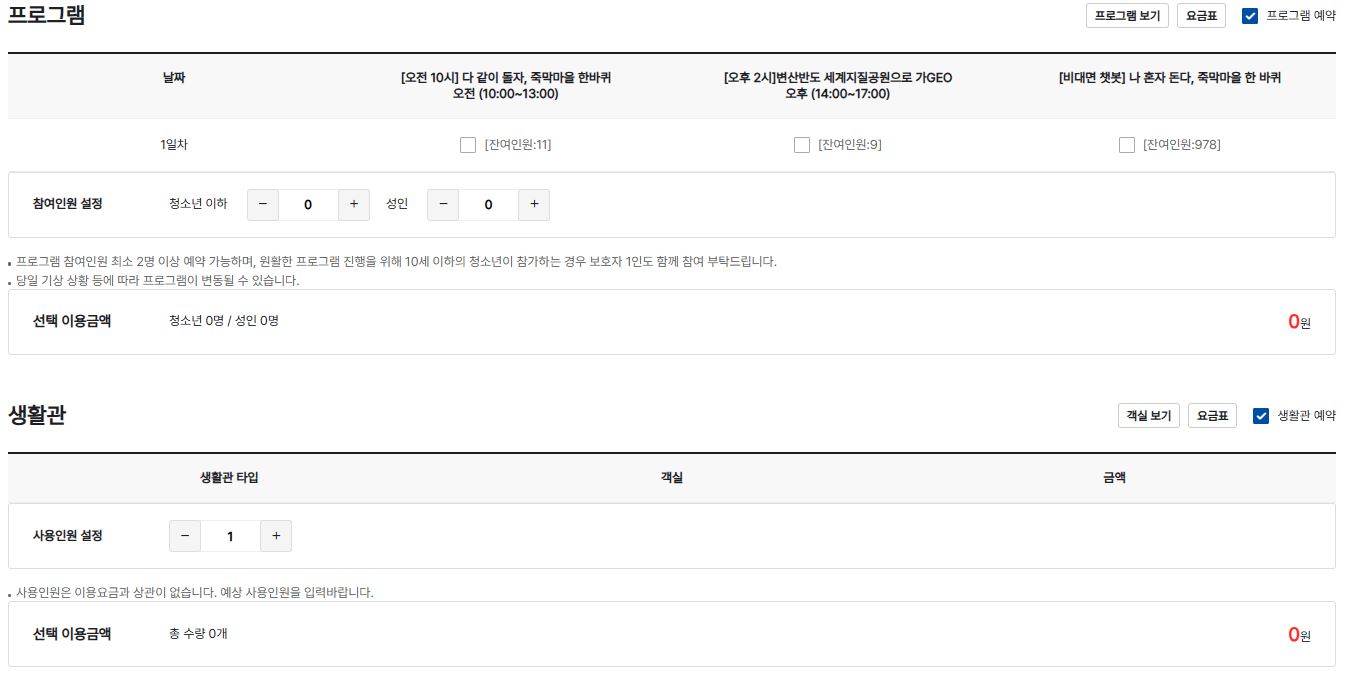 - 프로그램 예약 시(2인 이상) 생활관 이용 가능