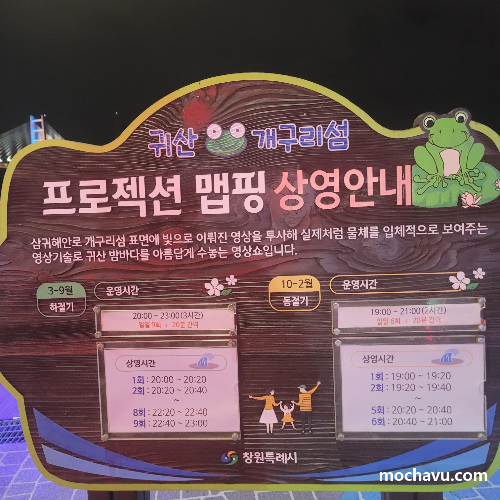 마창대교 앞에 작은 섬이 보이는데요. 개구리섬이라고 하네요~~ 멀리서 빔을 쏘아서 개구리섬에 영상이 나오는데요. 근처에서 노래도 나오고 가볍게 산책하면서 또 하나의 재미로 볼 수 있어요ㅎㅎ 프로젝션 맵핑이라고 하는데요. 상영안내는 위에 사진에 참고해주세요!!