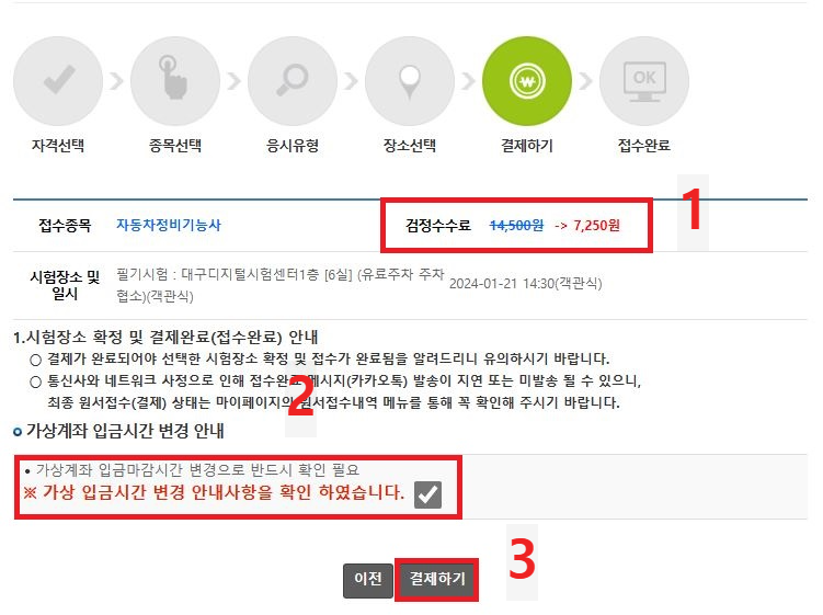 검정수수료가 50% 절감된 금액을 확인할 수 있습니다. 가상계좌 입금시간 변경 안내 확인 후 결제를 진행해 주시면 됩니다.