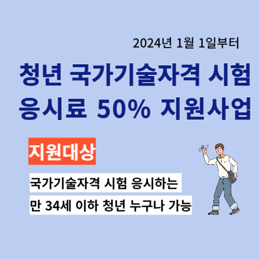 청년 국가기술자격시험 응시료 50% 지원은 한국산업인력공단에서 시행하는 지원사업으로 만 34세 이하 청년(1989년 1월 2일 이후 출생) 대상으로 지원합니다.