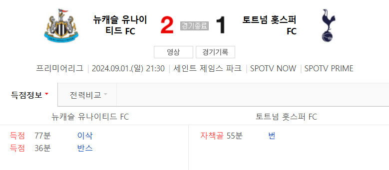 2024년 9월 1일 토트넘 대 뉴캐슬 경기결과는 2대 1로 토트넘이 패배하였습니다.
