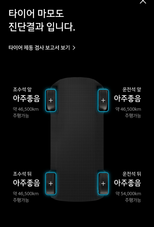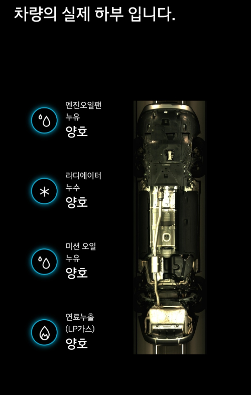 타이어 마모도와 차량의 하부를 확인하실 수 있도록 되어 있습니다. 진단결과 추후 주행가능 거리와 각종 누수/누유 여부를 진단한 결과를 확인하실 수 있습니다.