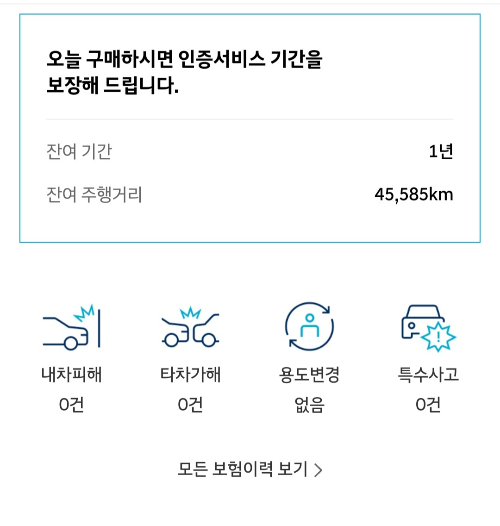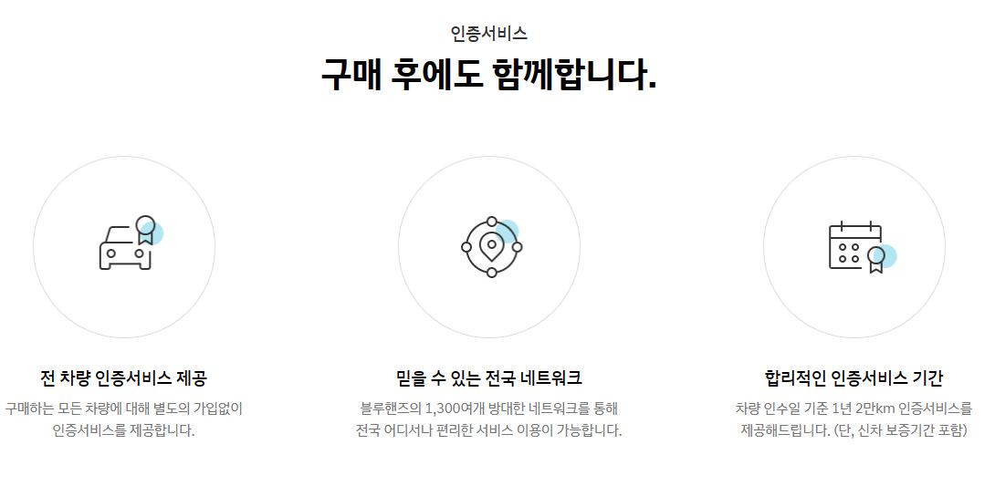 현대자동차 인증중고차를 구매하는 모든 차량에 대해 별도의 가입없이 인증서비스를 제공합니다. 믿을 수 있는 전국의 블루핸즈 1,300여 개 방대한 네트워크를 통해 전국 어디서다 편 라하게 이용이 가능하며, 합리적인 인증서비스 기간으로 차량 인수일 기준 1년 2만km 인증서비스를 제공하고 있습니다.(단, 신차 보증기간 포함), 해당차량의 신차보증기간이 1년/2만km 미만이 남았을 경우 부족분만큼만 중고차 보증을 더해드립니다.