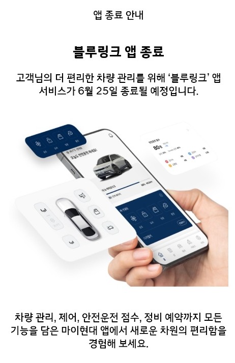 블루링크 서비스 종료(6월 25일)로 마이현대 앱을 통합하여 서비스가 제공됨으로 기존 블루링크 이용한 경우 마이현대 앱을 다운로드 해주세요.