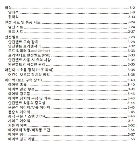 시트 및 안전장치에서는 좌석 및 열선/통풍시트, 로드 리미터, 에어백 등 정보사항을 확인할 수 있습니다.