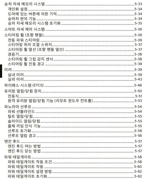 시동 및 주행에서는 자동 변속기, 패들쉬프트 요령, 제동장치, 통합 주행모드 시스템, 프리뷰 전자제어 서스펜
