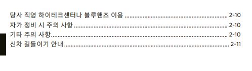 안전 및 주의사항에서는 블루핸즈 이용 및 엔진룸 점검, 일상점검, 신차 길들이기 등 정보를 확인할 수 있습니다.