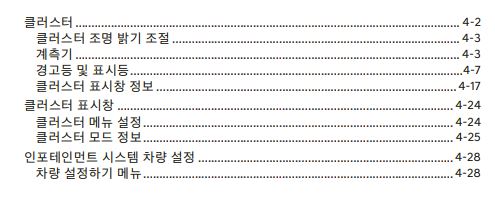 클러스터에서는 조명 밝기 조절 및 표시창, 인포테인먼트 시스템 설정 등 정보를 확인할 수 있습니다.