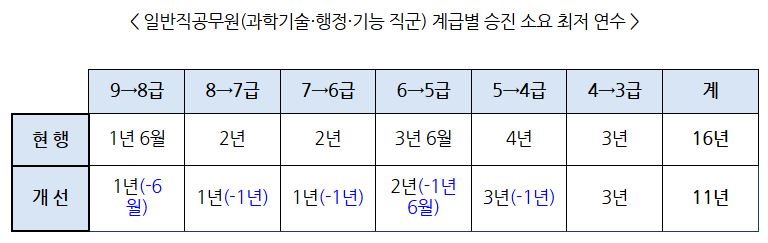 9급 공무원이 3급까지 승진하려면 최소 16년 이상 근무해야 했지만5년이 줄어든 11년 근무에 승진이 가능합니다.