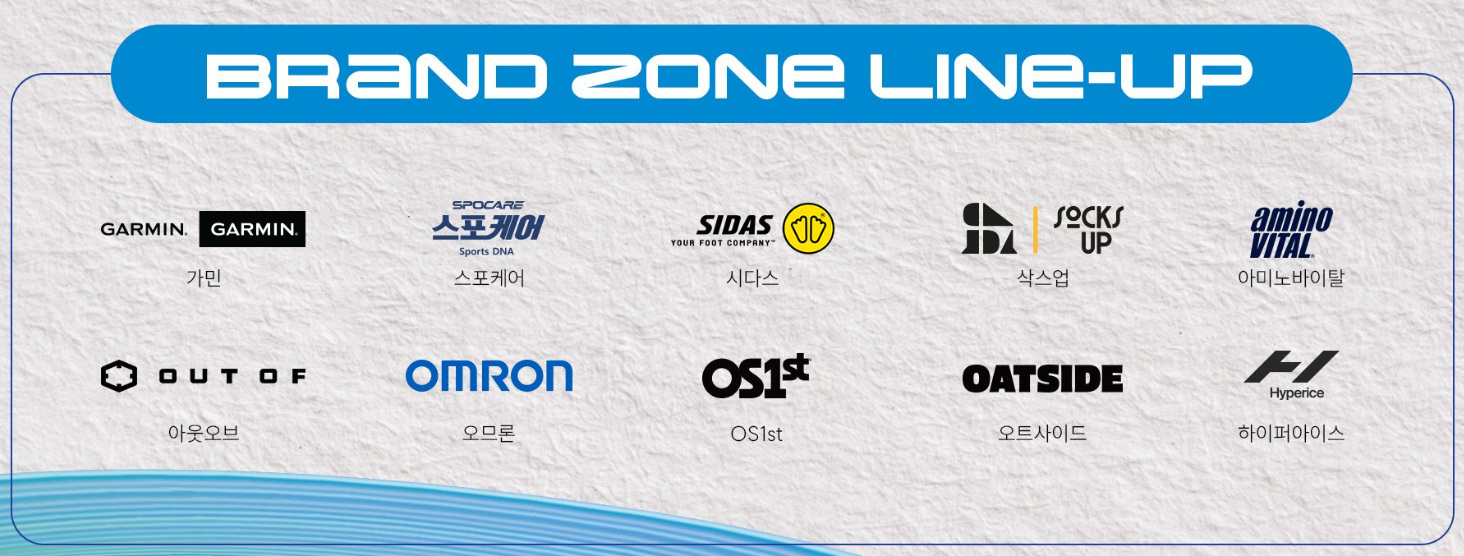 2025 미즈노 런페스타에 참여는 브랜드존 라인업입니다.(가민, 스포케어, 시다스, 삭스업, 아미노바이탈, 아웃오브, 오므론, OS1st, 오트사이드, 하이퍼아이스)
