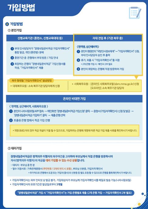 장병내일준비적금은 기본적으로 신병훈련소 입소 시 훈련기간 중 부대 인사담당자 및 은행에서 직접 방문하여 훈련병 대상 제도 소개 및 가입을 대면하여 처리해주고 있습니다.
