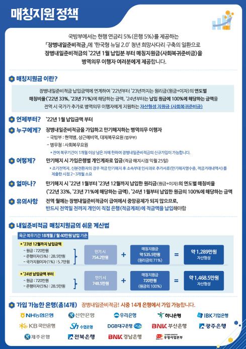 매칭지원금은 장병내일준비적금과 연계하여 원금 + 이자의 매칭비율로 납입원금에 100%에 해당하는 금액을 전역 시 추가로 정부가 지원해주는 정책입니다. (22년은 33%, 24년 71%, 24년 100%)