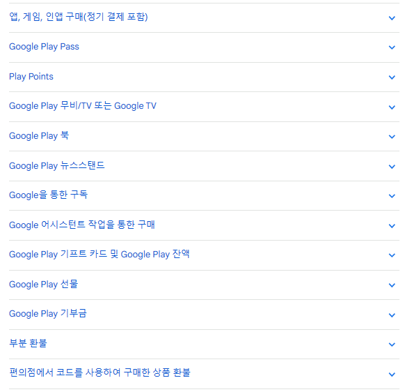 앱, 게임,인앱 구매(정기 결제 포함), Goolge TV, Google Play Pass 등 구매한 상품에 따라 환불정책을 꼭 확인 후 요청을 진행하셔야 합니다.
